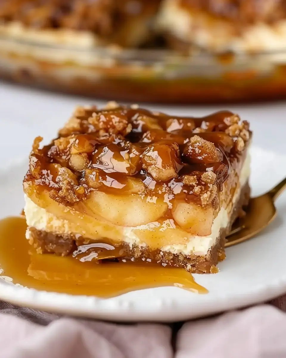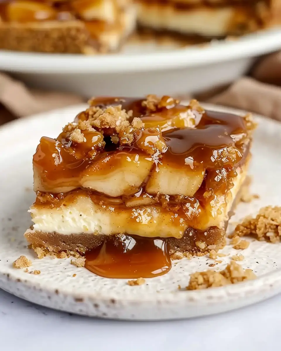 Indulge in the delicious layers of caramel and apple in these cheesecake bars, perfect for the fall season!