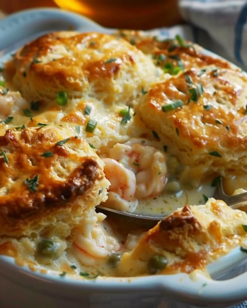 Delight in the creamy goodness of Cheddar Bay Biscuit Seafood Pot Pie, a comforting dish packed with seafood and topped with irresistible biscuits.