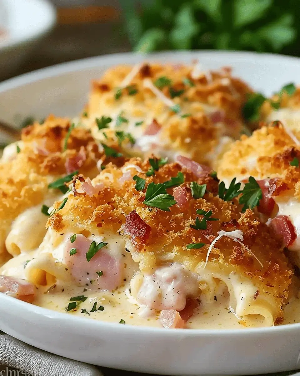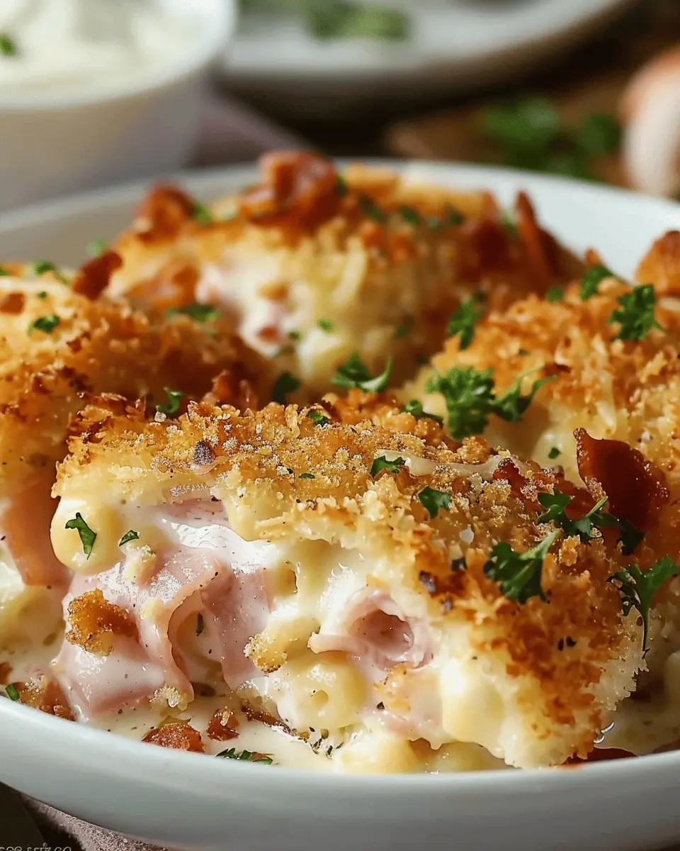 To achieve that perfect crunchy topping on your Chicken Cordon Bleu Casserole, consider using breadcrumbs mixed with a bit of melted butter. This combination creates a golden brown, crispy layer. For an extra punch, try adding grated parmesan or crushed up Turkey Bacon. If you’re feeling adventurous, season your topping with garlic powder or Italian herbs for added flavor.