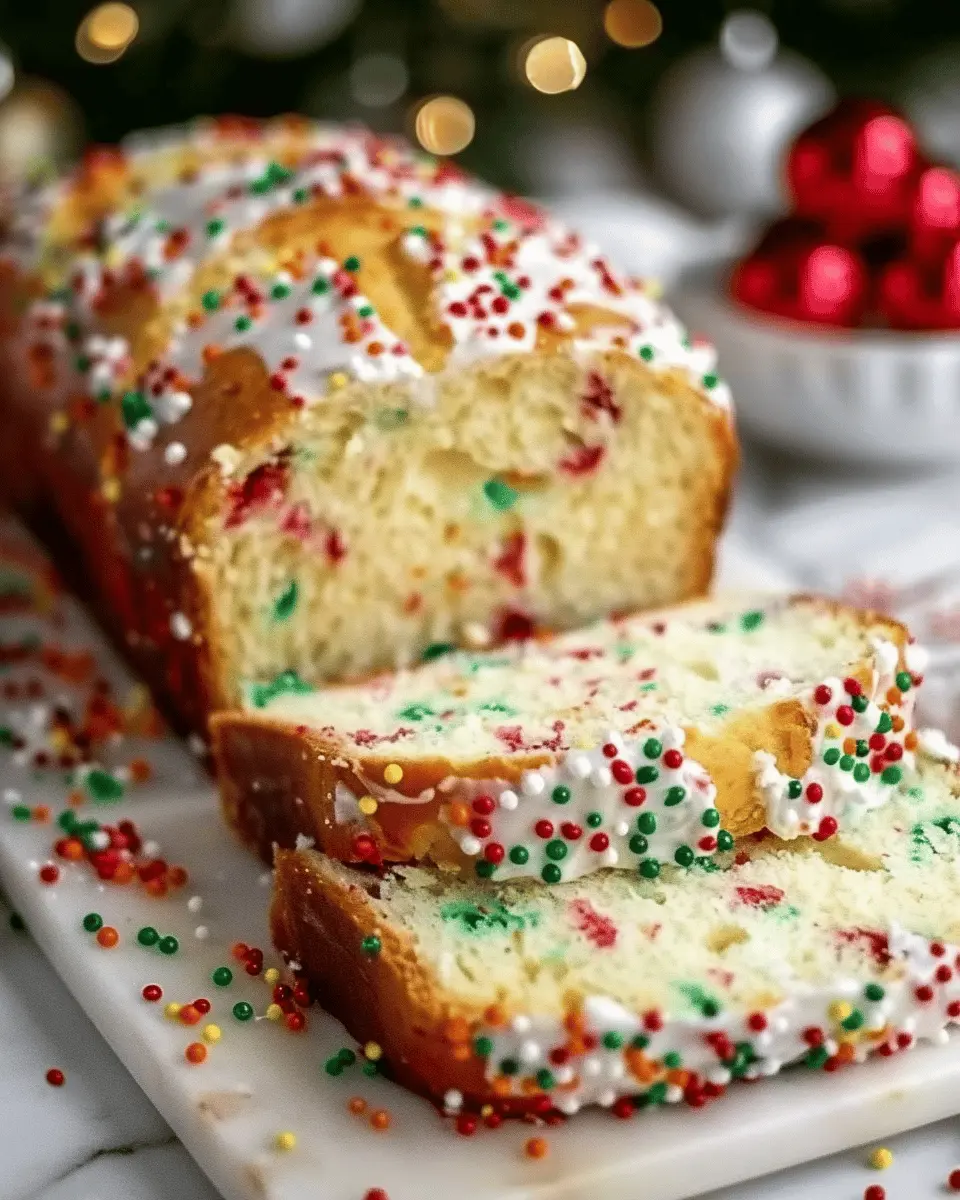 This enchanting bread is not just a culinary delight; it’s a canvas for your holiday creativity. Imagine slicing into a loaf that’s speckled with vibrant sprinkles, just waiting to add a pop of color to your table. But it’s not just the looks that count—this bread’s rich buttermilk base ensures each bite is indulgently soft and moist, capturing the very essence of holiday cheer.