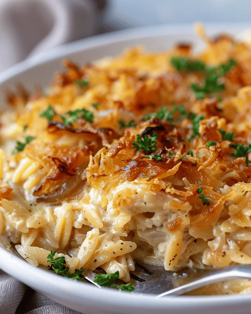 A delightful and hearty casserole featuring French onion flavors and tender orzo, perfect for family dinners.