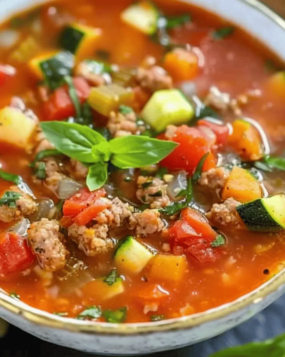 A delicious and nutritious soup packed with zucchini, tomatoes, and Italian sausage.
