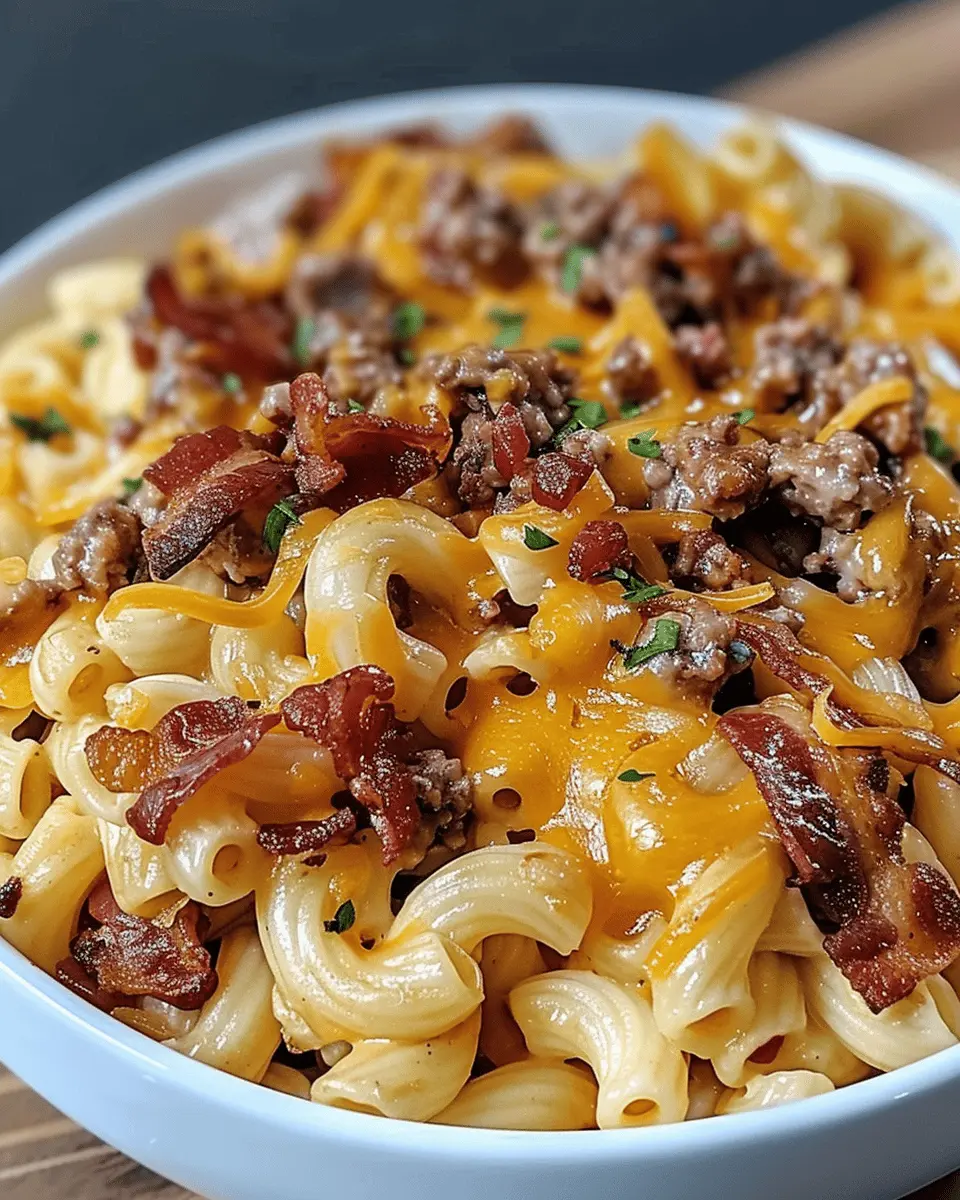A delicious and indulgent pasta dish that combines the flavors of bacon cheeseburgers with turkey bacon and chicken ham.