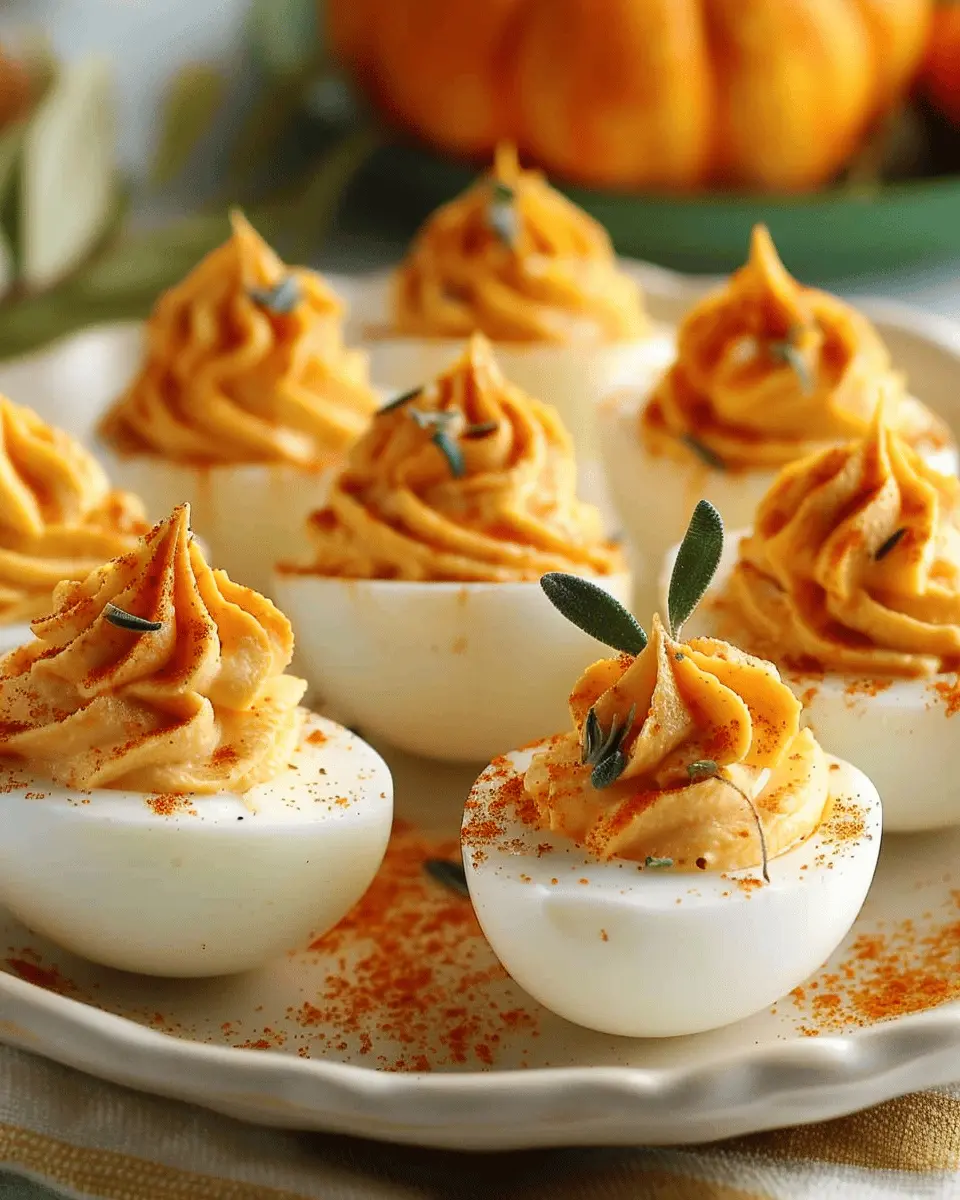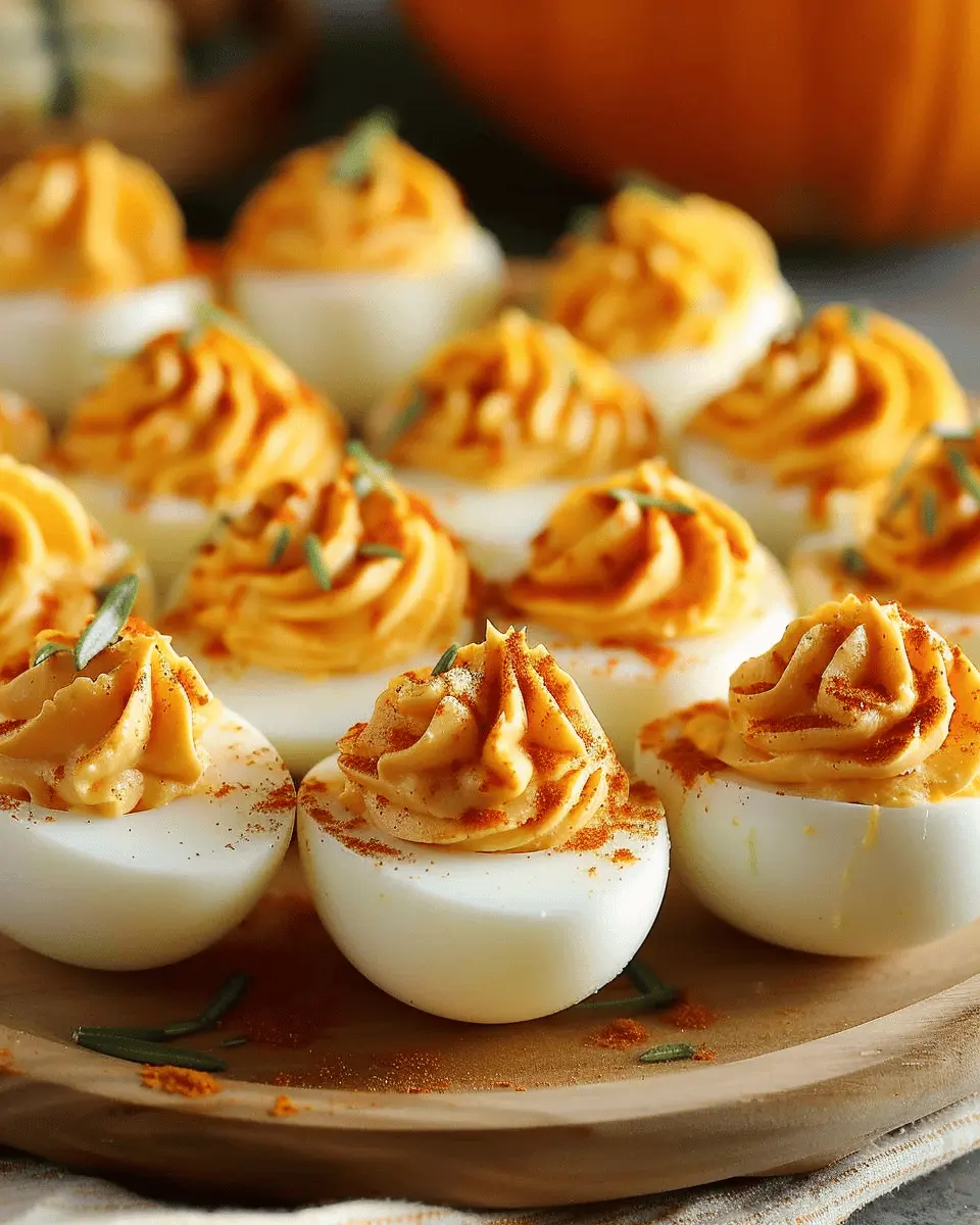 When it comes to showcasing your pumpkin patch deviled eggs, presentation is key. Try arranging them on a rustic wooden board lined with parchment paper, adding a sprinkle of paprika to mimic pumpkin seeds. For a festive touch, use mini pumpkins or gourds to frame your dish. You can also place the eggs on a bed of arugula or kale—this not only adds a vibrant color contrast but also introduces a peppery flavor that pairs well with the creamy filling.