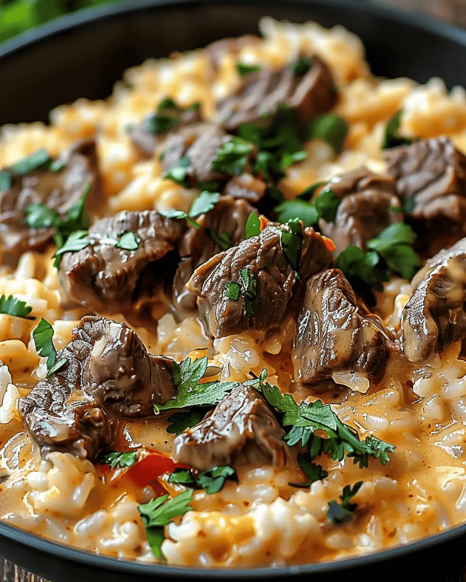 A delicious and comforting dish that combines steak, queso, and rice for a delightful meal.