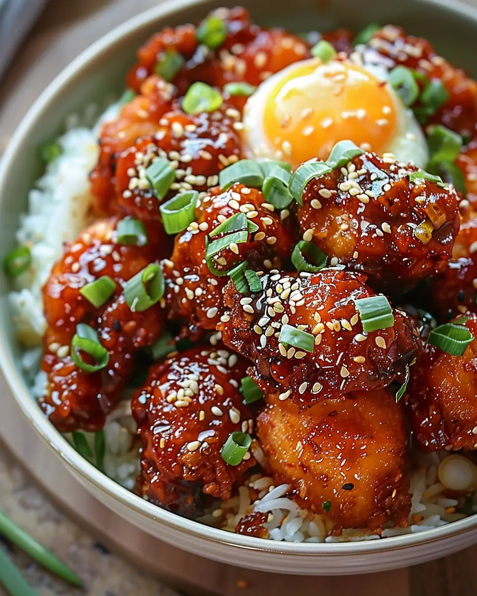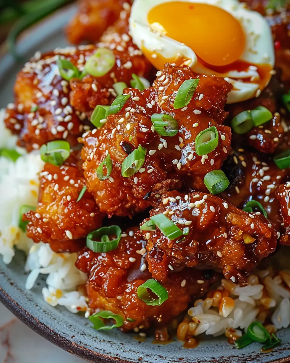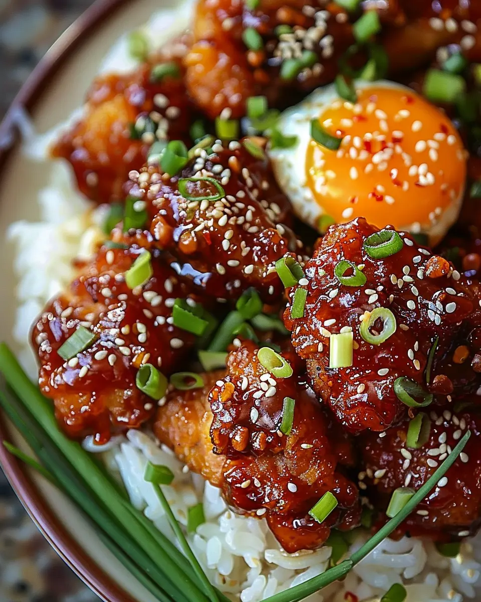- Serve your sticky Korean fried chicken over the warm rice, garnishing with sesame seeds and sliced green onions for that perfect finishing touch. You can even serve it with a side of pickled vegetables for added flavor and crunch.