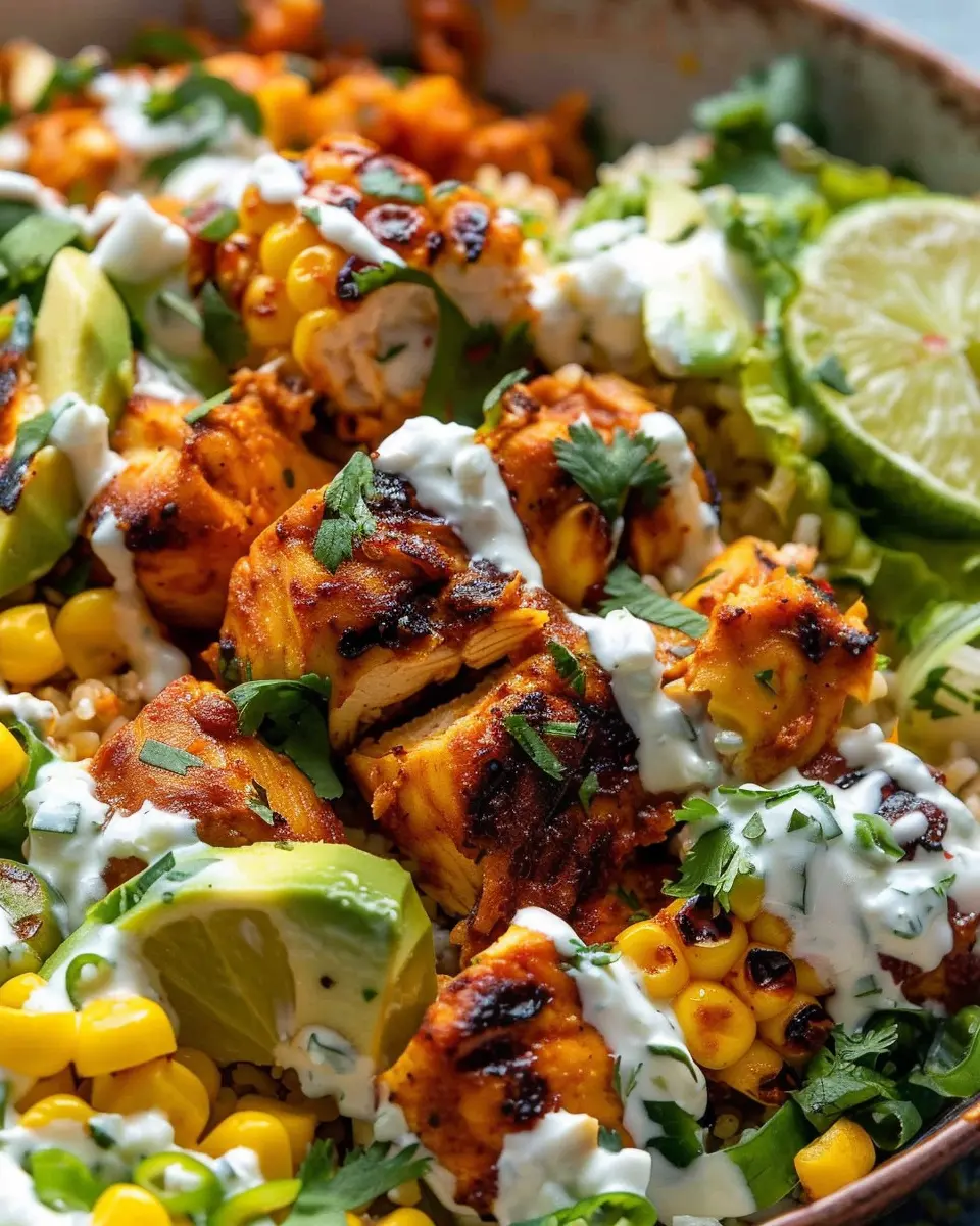 This combination adds a creamy texture and freshness to your tasty street corn chicken bowl.